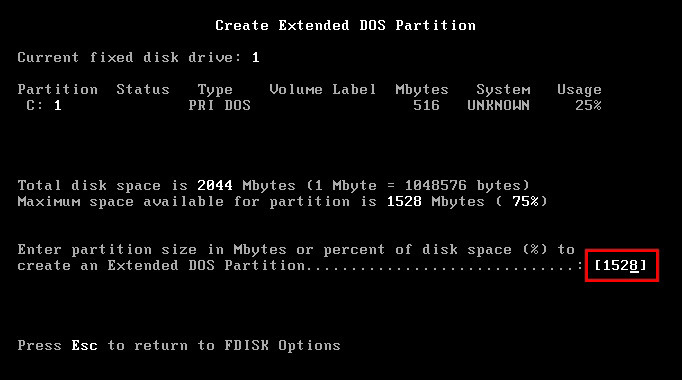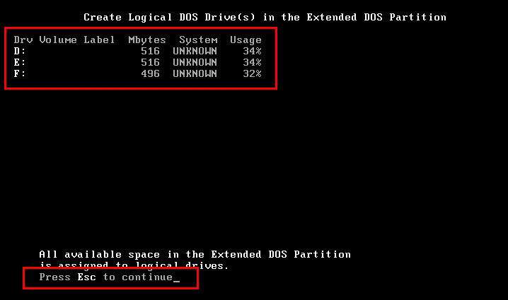 這里可以看到已經建好了一個擴展分區,按Esc鍵返回就會讓你分配邏輯卷分區的大小。