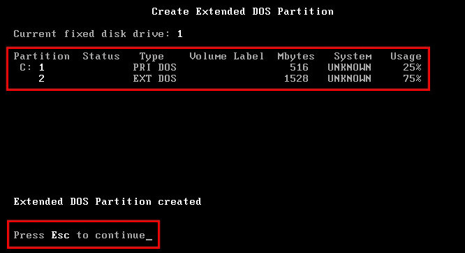 這里可以看到已經建好了一個分區,按任意鍵重啟依然是選擇other IDECD-ROM,如果硬盤大于2048M繼續運行fdisk建立擴展分區,直至完全分好區,按esc重啟,分區這塊很簡單,簡單介紹到這里,筆者共建了四個分區,C、D、E、F。