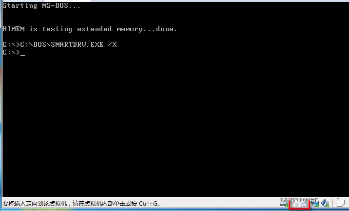 (2)如圖所示,點擊所示按鈕,虛擬機開始從我們的虛擬軟盤上啟動DOS