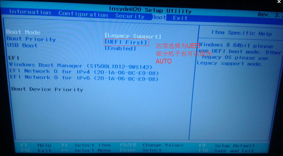 boot mode項(xiàng)中第一項(xiàng)改成了legacy support boot priority項(xiàng)中的選擇為:UEFI First或AUTO部分機(jī)子有AUTO也可以選擇為自動(dòng),沒(méi)有的選擇成UEFI做完上述更改后按FN+F10或F10 保存設(shè)置 重啟進(jìn)入系統(tǒng)后用黑云一鍵重裝系統(tǒng)。設(shè)置完成后就可像普通電腦模式一樣選擇系統(tǒng)自動(dòng)安裝,設(shè)置過(guò)主板工具在次提示時(shí),點(diǎn)否就行了,原版WIN8用戶建議選擇WIN764位 UEFI專版 或WIN864位進(jìn)行重裝。