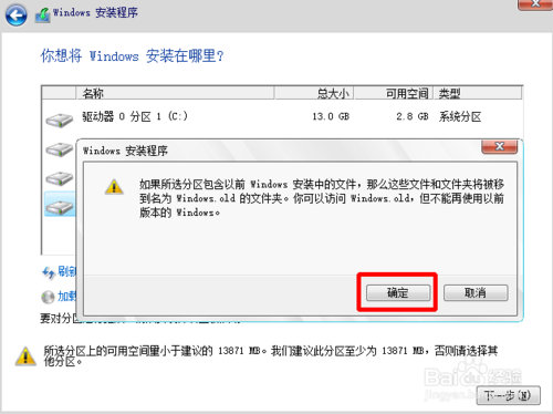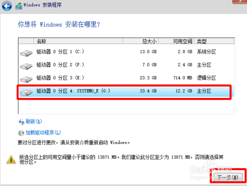5、好了,選擇之前準備好要安裝win10的盤符(C盤以外)--確定!!!