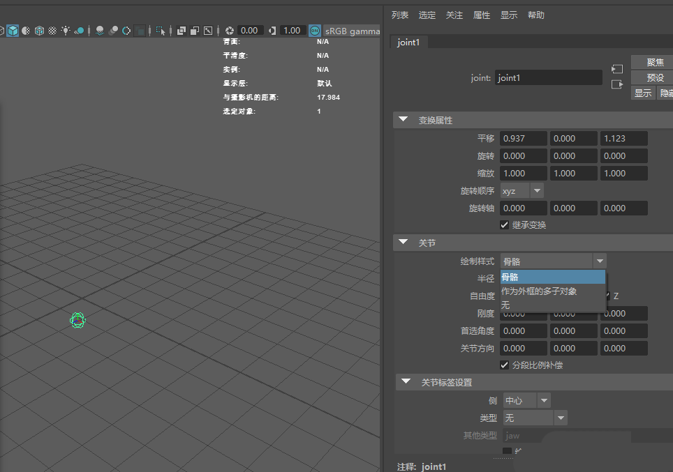5、最容易忽略的就是最后一種情況了,就是繪制樣式選擇了無,ctrl+a快捷鍵打開屬性編輯器(如果默認打開就不用再打開了),在右邊的關節》繪制樣式下拉框里面我們選擇無 就不顯示骨骼,選擇骨骼就是我們熟悉的樣式了,如圖所示