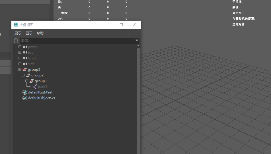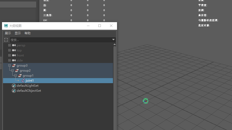 3、我們選擇骨骼joint1,點擊快捷鍵ctrl+h隱藏joint1,我們想顯示的話就在大綱視圖再次選擇joint1,點擊快捷鍵shift+h就顯示了
