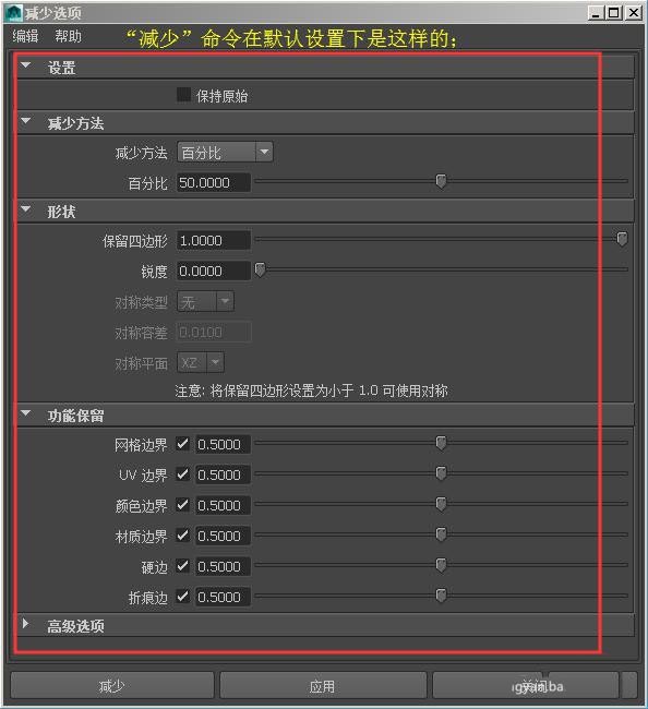 1、“減少”命令,(在“多邊形模塊——網格”);主要作用是減少模型上的面,簡化模型;如圖所示: