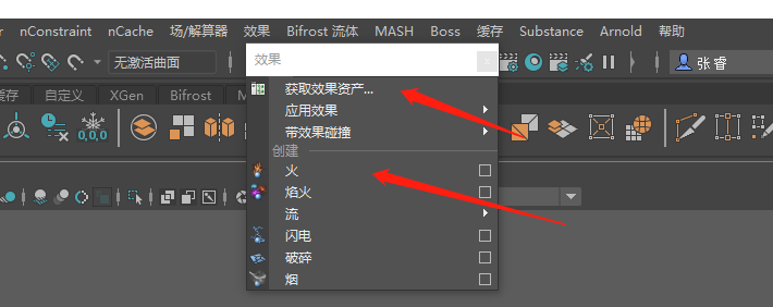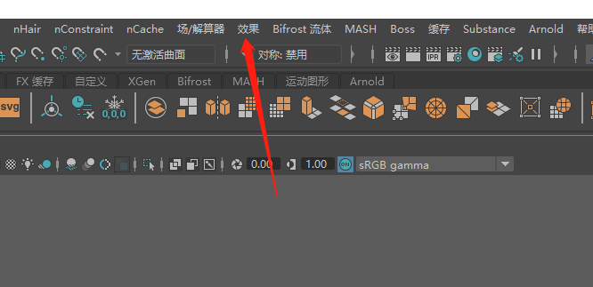 3、點(diǎn)完后,我們發(fā)現(xiàn)整個(gè)菜單欄界面發(fā)生了變化,再次點(diǎn)擊maya上方的“效果”選項(xiàng)。