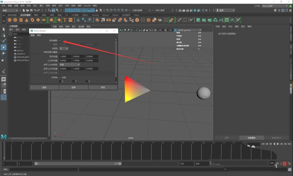 2、約束》目標(biāo),點(diǎn)擊后面的小方塊,打開目標(biāo)約束選項(xiàng)窗口,勾選保持偏移,“添加”目標(biāo)約束