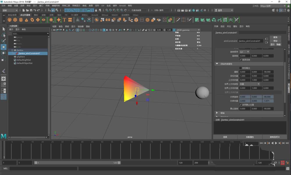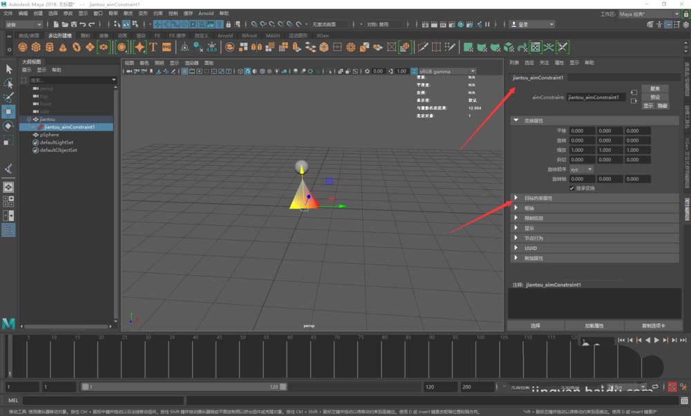 1、首先我們創(chuàng)建一個目標(biāo)約束,先選擇“pSphere”對象,按住shift按鈕加選“jiantou”對象