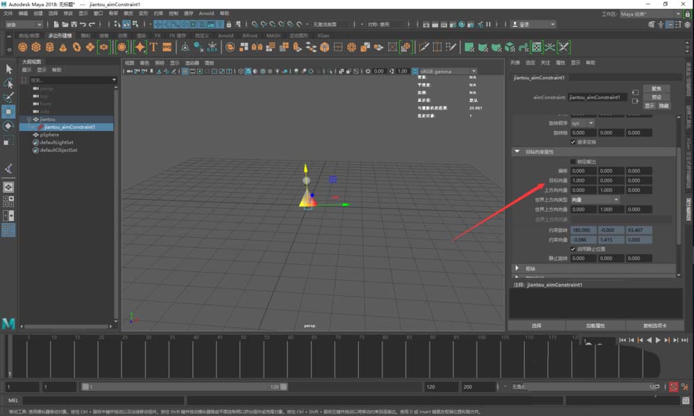 3、好了我們按照默認(rèn)設(shè)置創(chuàng)建了一個目標(biāo)約束,當(dāng)我們移動小球到箭頭正上方或者正下方的時候,我們發(fā)現(xiàn)箭頭發(fā)生了翻轉(zhuǎn)。這是什么問題呢