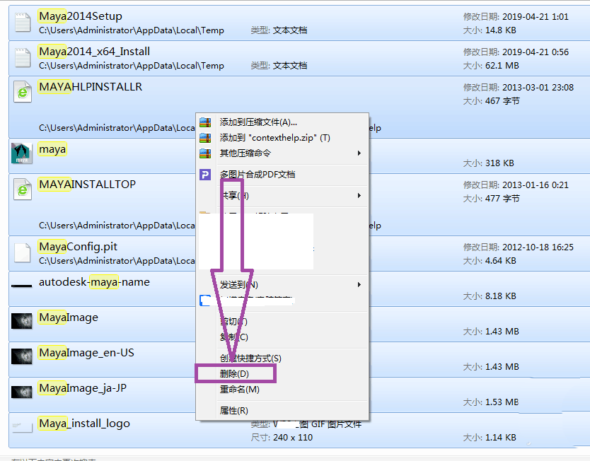 8、最后選中所用的搜索結果,用快捷鍵DEL或者Shift+DEL進行刪除緩存文件,也可以選中所用的搜索結果,然后右擊,彈出右擊下拉子菜單,在子菜單中找到“刪除”,然后點擊“刪除”,也可以刪除maya的緩存。