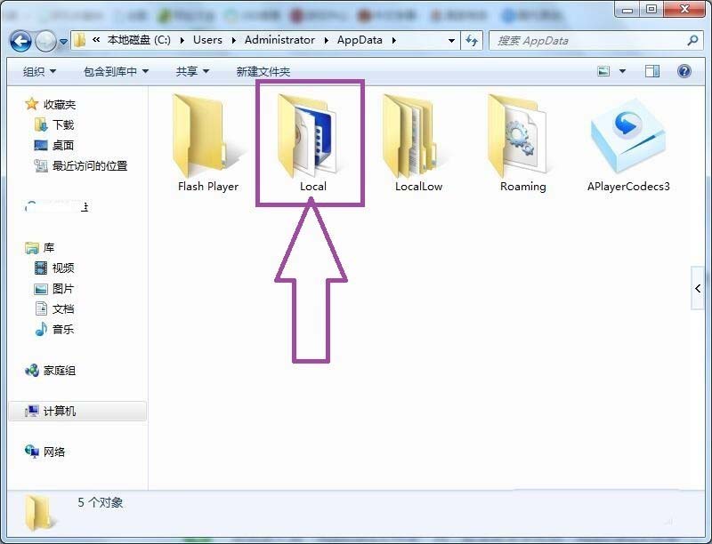 4、雙擊進入到“AppData文件夾”內,在文件夾中找到“Local文件夾”。