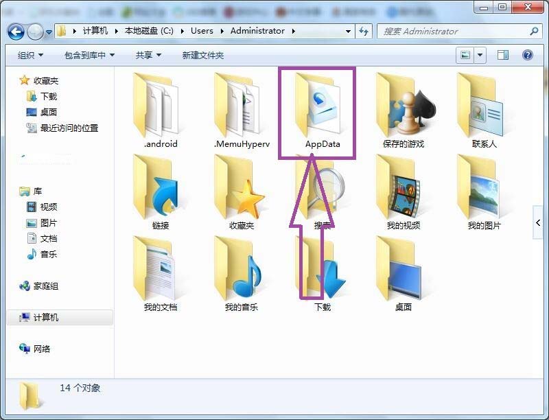 3、雙擊進入到“administrator文件夾”內,在文件夾中找到“AppData文件夾”。