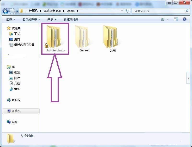 2、雙擊進入到“user文件夾”,在文件夾內找到用戶名文件夾如“administrator文件夾”。