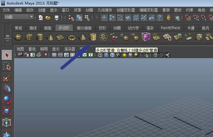 1、打開Maya軟件后,這里用的是2013版,在菜單工具欄中,鼠標左鍵單擊【多邊形】下的圓環體圖形,如下圖所示。
