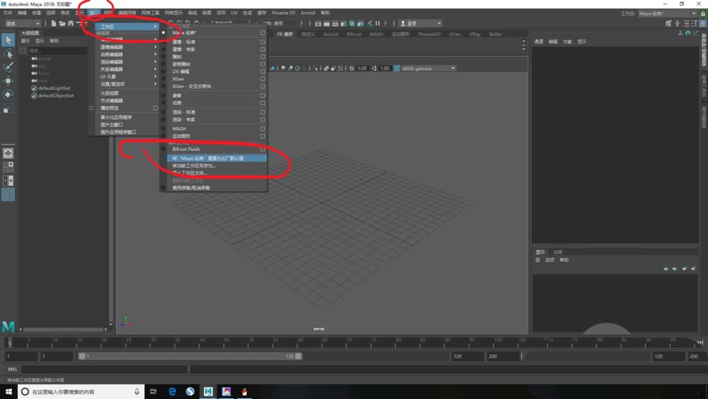 4、我們先將maya的UI界面重置為最初的界面,只要點擊窗口---工作區---重置maya經典為出廠設置,然后界面便回到我們最為熟悉的操作界面