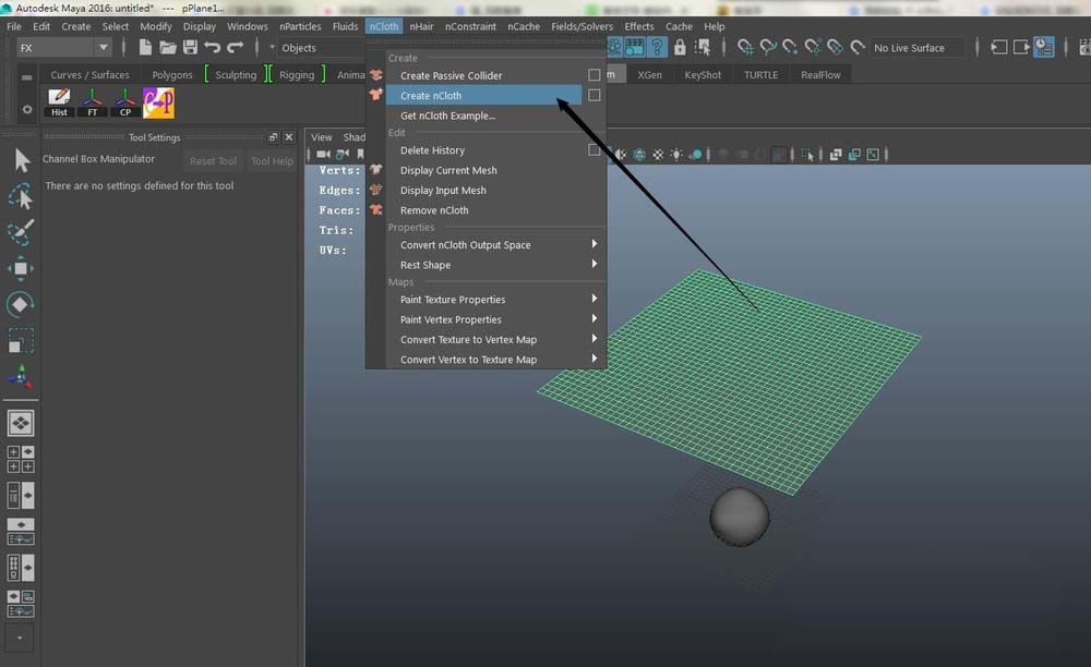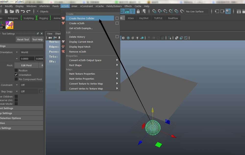 6、選擇碰撞物,執行ncloth--->create passive collilder