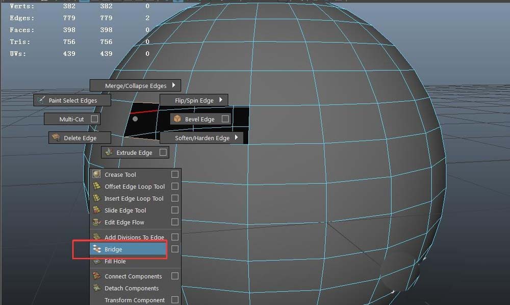 4、如果想要對面進行縫補或封口,可以在線模式下面,選中兩條對邊進行橋接補面