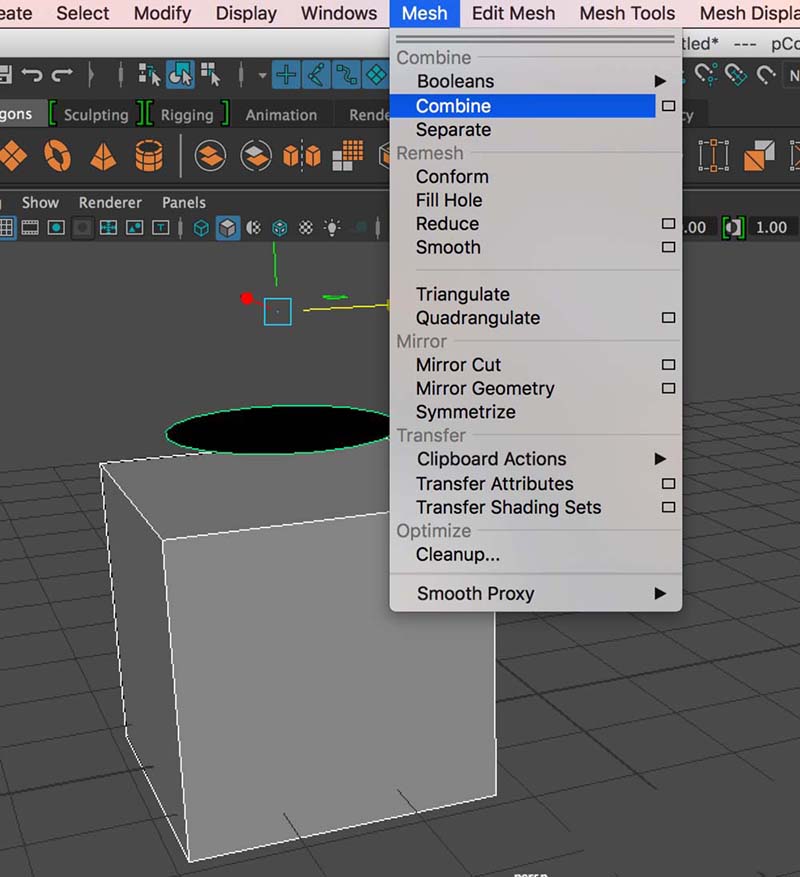 2、選擇立方體,按shift加選圓片,點擊“網格-合并”【Mesh-Combine】將兩個模型合并。