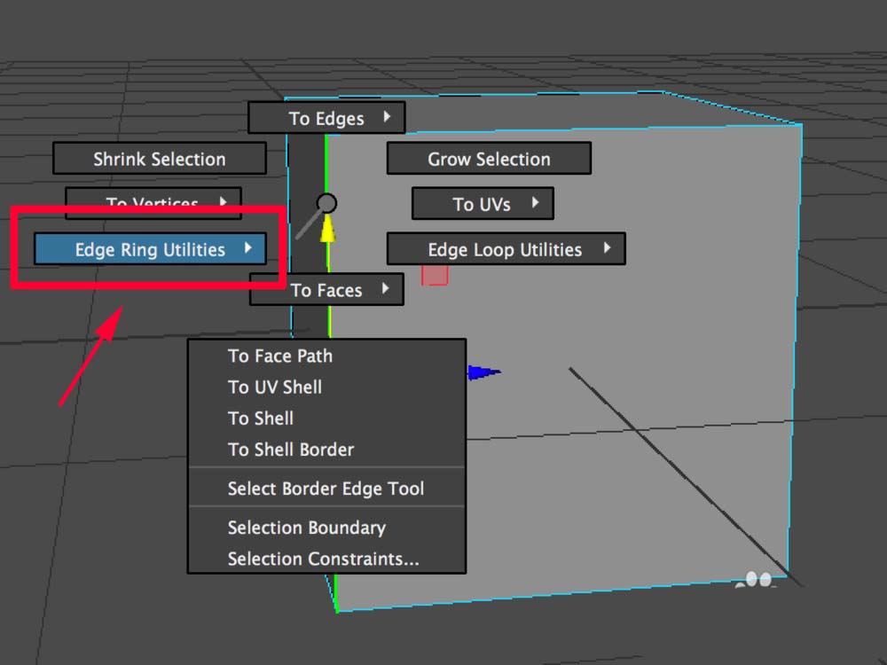 2、選中要打洞的那個面上的一條邊,Ctrl➕鼠標右鍵選擇左下角【Edge Ring Utilities-To Edge Ring And Split】平均分割邊線并添加循環線。縱向上用同樣方法操作。