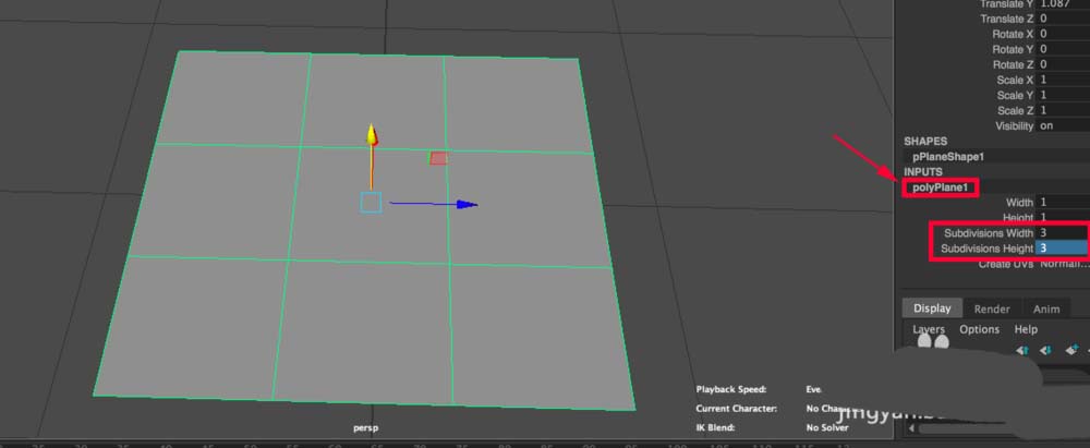 1、首先創建一個多邊形平面【Create-Polygon Primitives-Plane】,在右側通道盒里將寬度細分和高度細分都改為“3”。