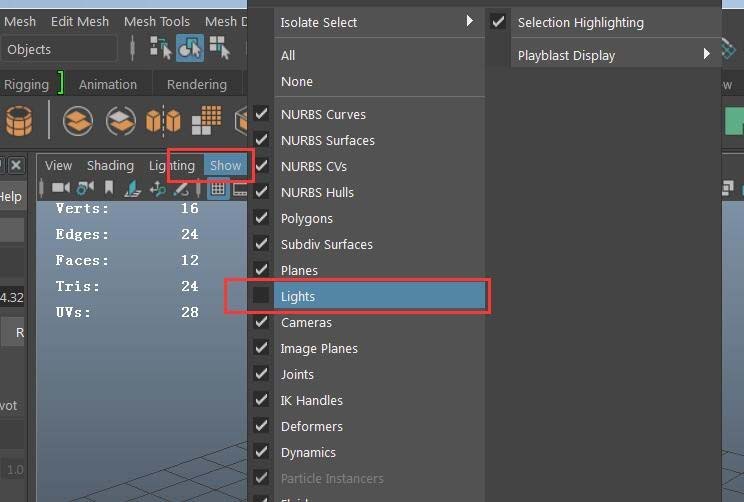 4、也可以在show里面取消light的選擇,這樣所有的燈光就會(huì)全部消失(注意這里只是看不到,但是作用還是有的);可以用此方法只顯示light然后框選就可以全部選中了。