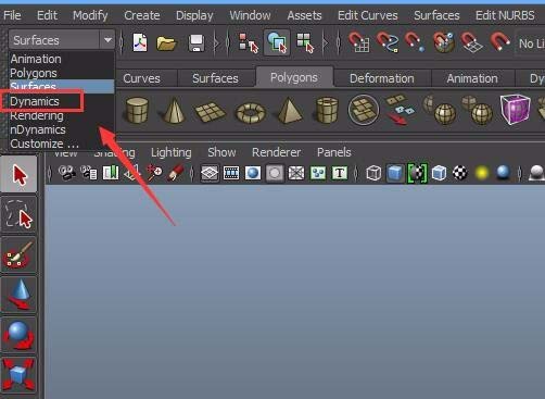 3、選擇創建的球體,然后再將模塊切換為dynamics選項,如圖所示: