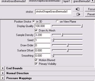 我想要生長(zhǎng)在山上的草地,所以需要隨機(jī)放置這些草,還需要一些枯草,就是“夏天結(jié)束”時(shí)的大自然的顏色。我們可以用深綠色和黃色來(lái)做亮點(diǎn)和每一根草尖。但是在更改顏色之前,要增加草的密度以覆蓋整個(gè)地形。做這個(gè)時(shí)可以打開(kāi)Attribute Editor,選擇一般的Bermuda草地配置面板,增加密度選項(xiàng)。
