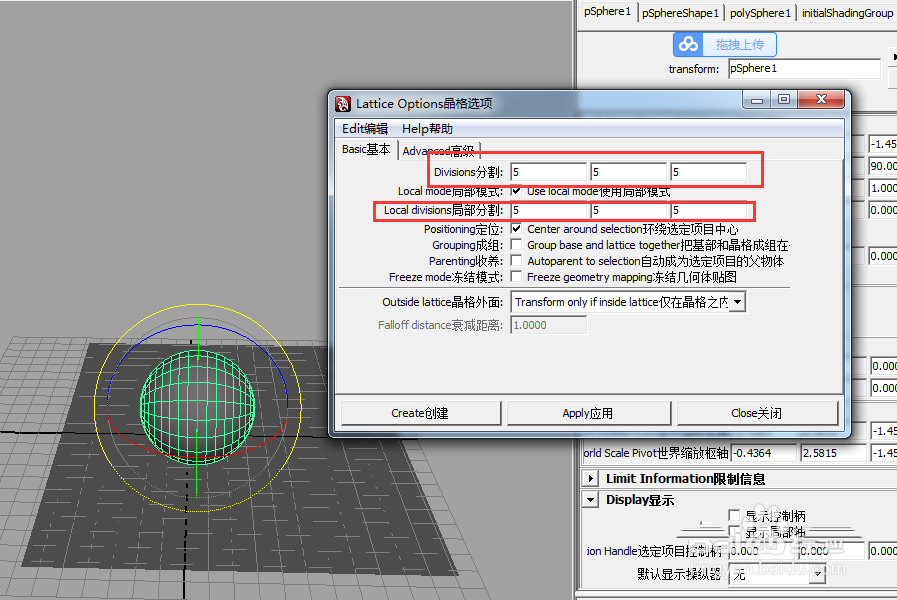 3、選中球體,在動畫模塊里的創(chuàng)建變形器里選擇晶格,點擊后面小方塊,輸入?yún)?shù),參數(shù)設(shè)置成555即可,看我的截圖