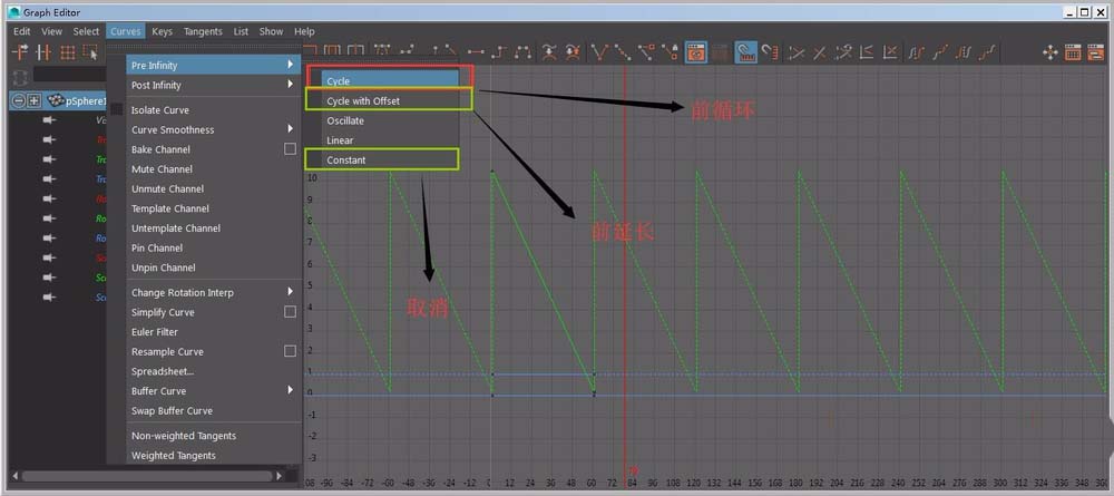 7、點(diǎn)擊curves--->pre infinity---cycle曲線向前循環(huán)、cycle with offset曲線向前延長(zhǎng)、constant取消