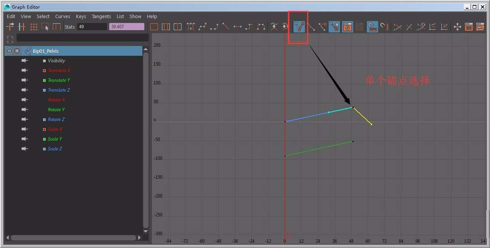 6、如果想自由拖拽單邊,需要選中點(diǎn)(關(guān)鍵幀),點(diǎn)擊curves---->weighted tangents,然后啟動(dòng)空心按鈕