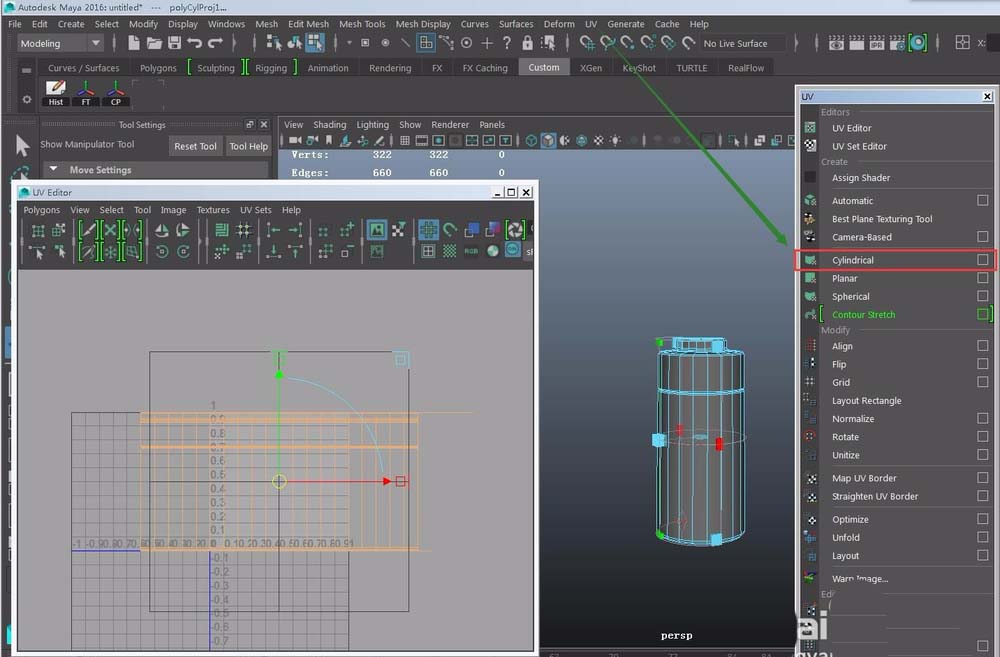 3、點(diǎn)擊模型,在model狀態(tài)下,將模型uv進(jìn)行初級(jí)投射,這比較像圓柱所以選擇圓柱投射