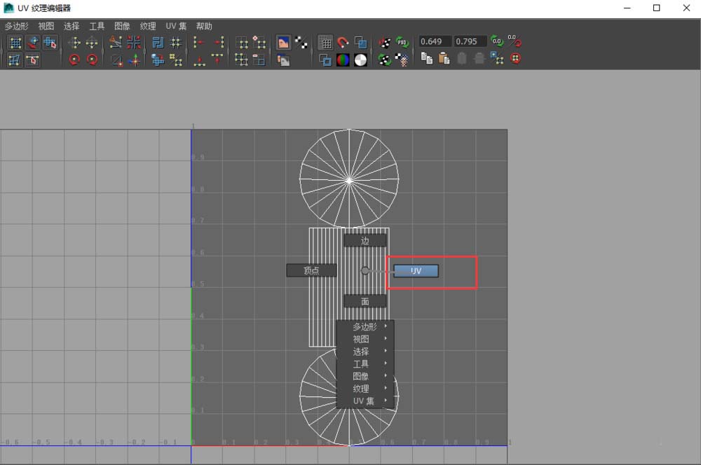 3、對著uv鼠標右擊按住不動拖拽選擇uv模式。