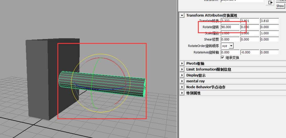 2、選中點(diǎn)擊圓柱體,按下鍵盤上的r鍵,進(jìn)行圓柱的旋轉(zhuǎn),屬性中輸入90度,將圓柱進(jìn)行一個旋轉(zhuǎn),如圖所示