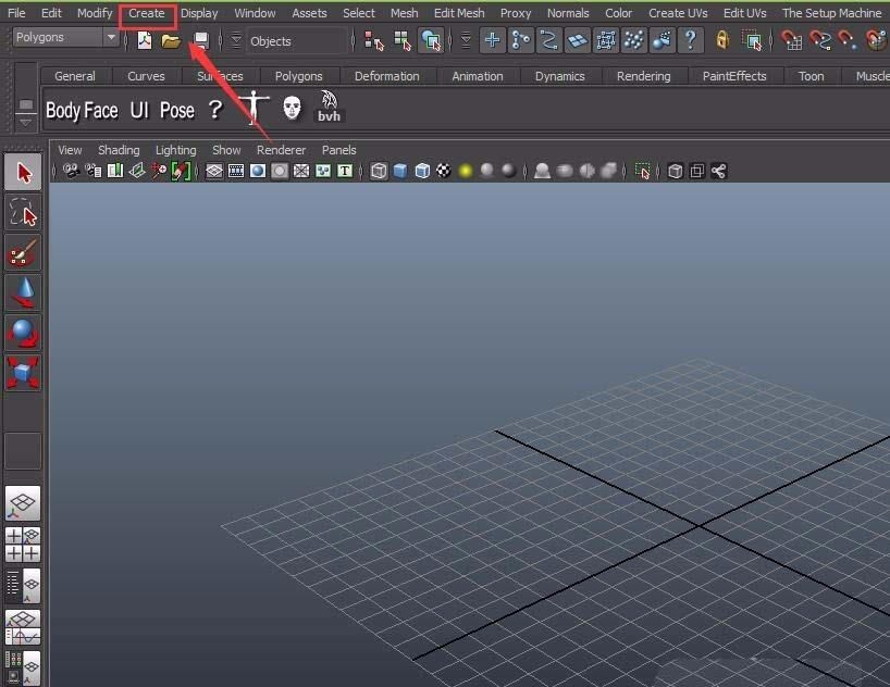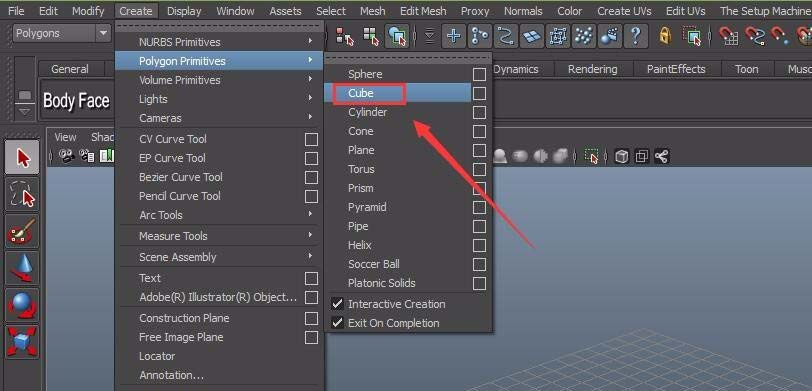 4、點擊create選項,在其子級菜單里找到polygons primitive選項,在其下拉菜單里找到cube選項,如圖所示: