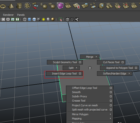 3、按住Ctrl+鼠標右鍵,如下圖所示,使鼠標移動到Insert Edge Loop Tool上,在立方體上建立一條環形邊,依次建立其他三條。