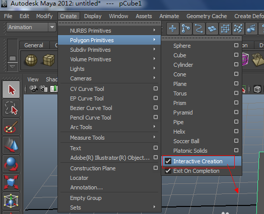 2、如下圖,需要注意的是,如果把interactive Creation前面的對號去掉的話,點擊cube,會在網格中心直接形成正方體。可用縮放工具(快捷鍵R)進行調節。