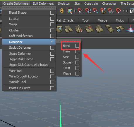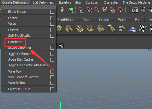 8、將模式切換到animation模塊,并在create deformers菜單里找到nolinear選項,如圖所示:
