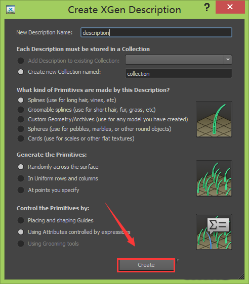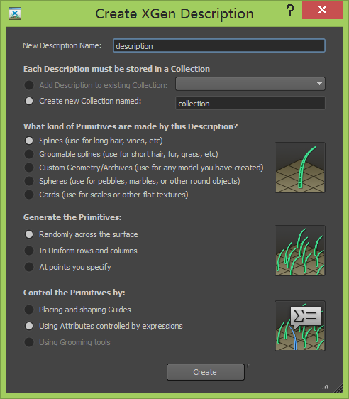 5、點擊xgen選項,在其內選擇create xgen description選項,點擊create xgen description彈出其對話框,如圖所示: