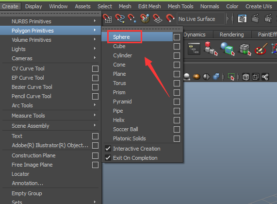 2、在該界面內找到create菜單,點擊create菜單在其子級菜單里找到polygons primitives選項,如圖所示: