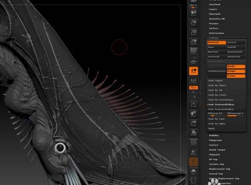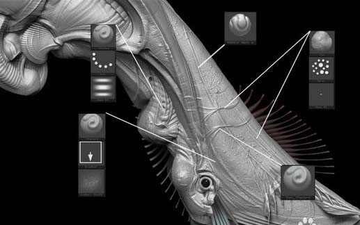 可以使用Dam Standard、Mah Cut和Inflate在形式上創建任何靜脈或皺紋,結合巖石alphas和Dam Standard在殼上創建崎嶇不平的甲殼綱動物紋理來銳化邊緣。