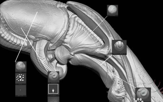 針對生物的肉質部分,可以先雕刻出簡單的形狀,然后使用ZBrush中的Array Mesh功能實現肋肉效果,接著結合偏移、縮放和旋轉來創建有趣的輪廓形狀。Array Mesh準備好之后,使用Move筆刷微調形狀,再DynaMesh形狀給其他細節雕刻表面。