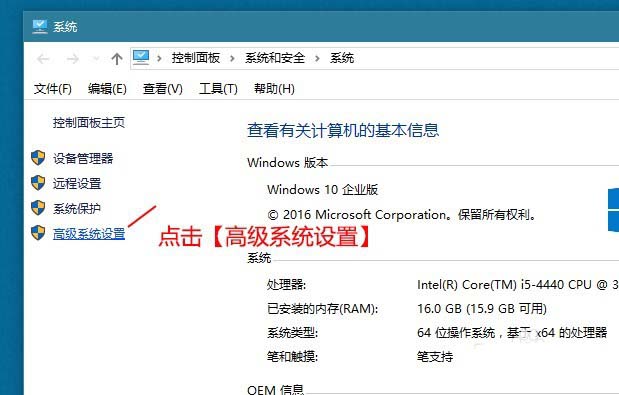 2、點擊【高級系統(tǒng)設置】進入【系統(tǒng)屬性】面板。