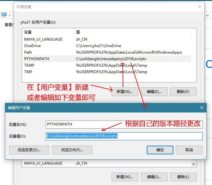 4、在【用戶變量】里新建一個變量(如果已有此變量,可直接進行編輯修改),填寫如下變量名和變量值:PYTHONPATH=C:/solidangle/mtoadeploy/2018/scripts,然后確定。(注意修改路徑的版本號)