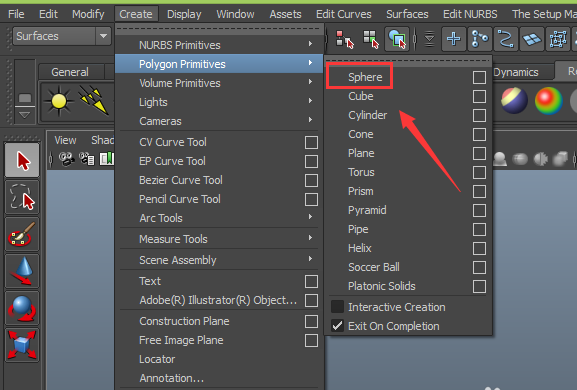 4、再找到create菜單里的polygon primitives選項里的sphere選項,如圖所示: