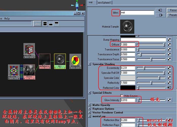 金屬材質(zhì)主要是在反射顏色上加一個環(huán)境球,在環(huán)境球上直接貼上一個黑白圖片,這里沒有使用ramp節(jié)點,參數(shù)如下圖。