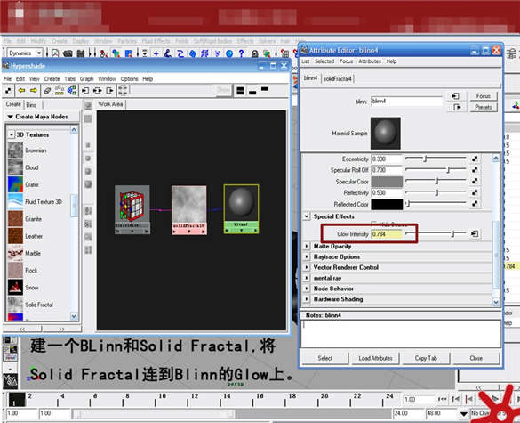 4、見一個BLinn和Solid Fraotal,將Solid Fraotal鏈接到BLinn的Glow上;