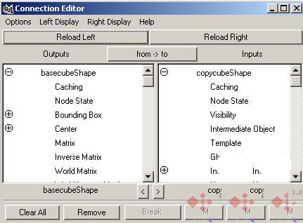 然后打開 Windows-%26gt;General Editors-%26gt;Connection Editor 。選中 basecube 和 copycube 的形節點 basecubeShape 和 copycubeShape , Reload 到 Connection Editor 的 Outputs 和 Inputs 窗口。