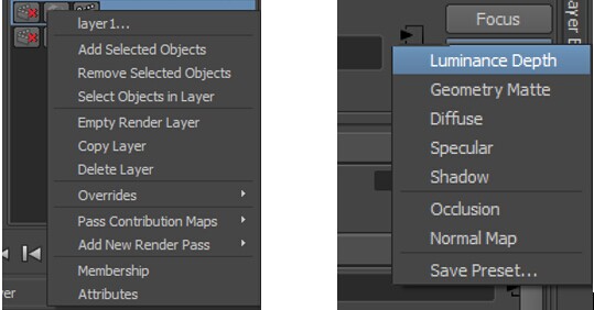如何獲得z通道呢,我們可以通過(guò)maya的渲染層預(yù)制來(lái)快速獲得。方法是將場(chǎng)景中的物體全部選中,放入一個(gè)新的渲染層,右鍵最后的選項(xiàng)attributes,會(huì)調(diào)出渲染層的設(shè)置,然后在presets預(yù)制里面,選擇luminace depth選項(xiàng),則所有該渲染層中的物體,都會(huì)被賦予能夠渲染出Z通道的材質(zhì)。