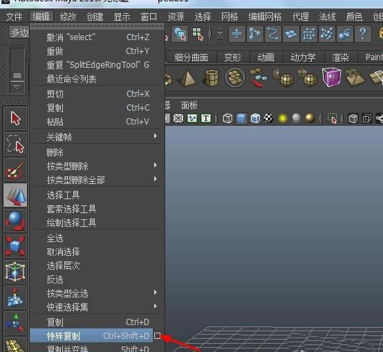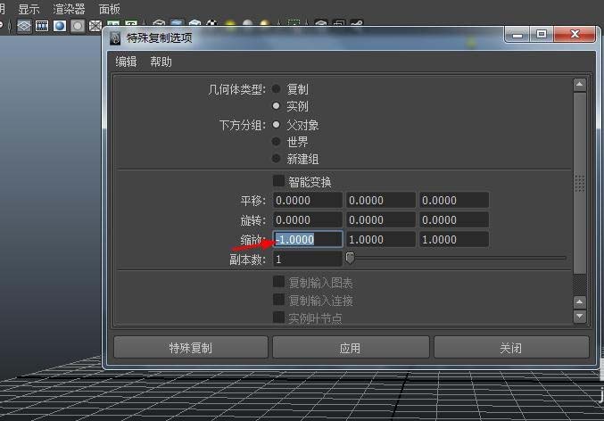 5、選擇模型,進(jìn)入“編輯>特殊復(fù)制選項(xiàng)”(單擊圖中箭頭處的小窗口),修改圖中箭頭處的值(縮放 x值)為-1,然后單擊”特殊復(fù)制“