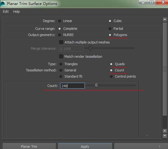 在設置窗口里面,一般而言,可以在output geometry選項中選擇polygons,在type選項中選擇quads(這樣是四邊面,當然如果需要也可以選擇前面的triangles三邊面),在tessellation method中選擇count(計面數(shù)的方式),最后再在下面的count里面設置自己需要的面數(shù)。