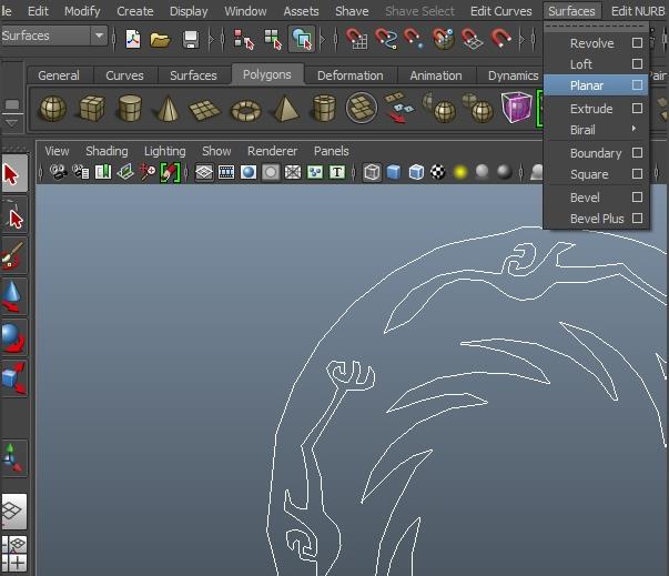 然后,將導出文件直接拖入到maya中。全選路徑,在surfaces板塊里面,依次選擇surfaces--planar,點開后面的小方框。